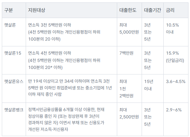 햇살론은 총 4개로 구분되며 지원대상과 한도, 금리는 아래와 같습니다.