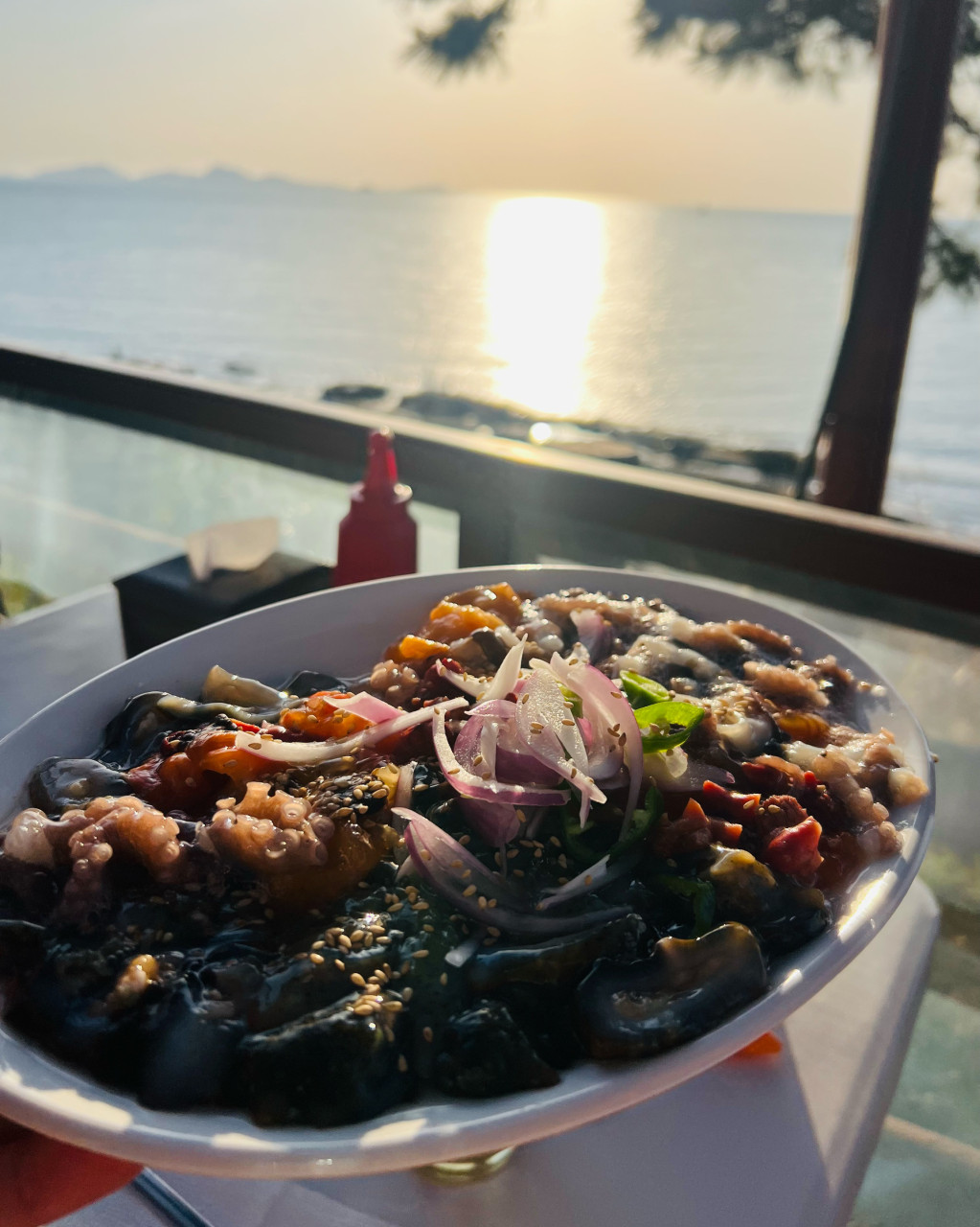 바다를 눈앞에 두고, 그날 준비된 싱싱한 멍게와 낙지, 전복, 해삼을