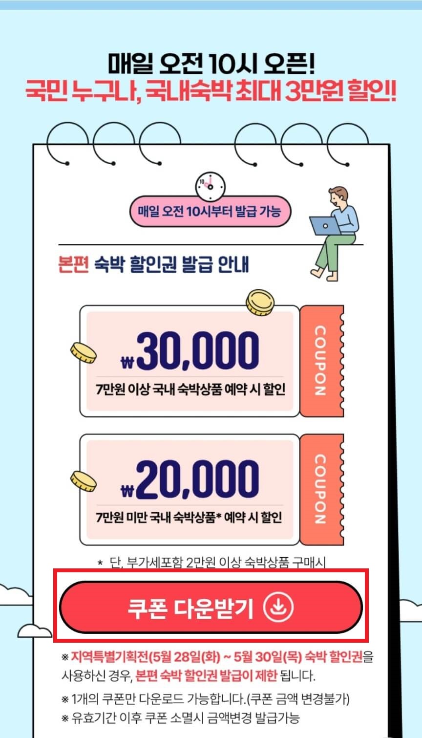 숙박세일 페스타 본편에서는 2024년 6월 3일 오전 10시부터 선착으로 숙박 할인쿠폰 3만원을 선착순으로 지급하고 있습니다.