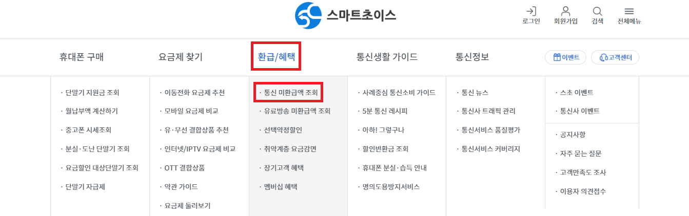 ① 스마트초이스 사이트 접속 > 환급/혜택 > 통신 미환급액 조회