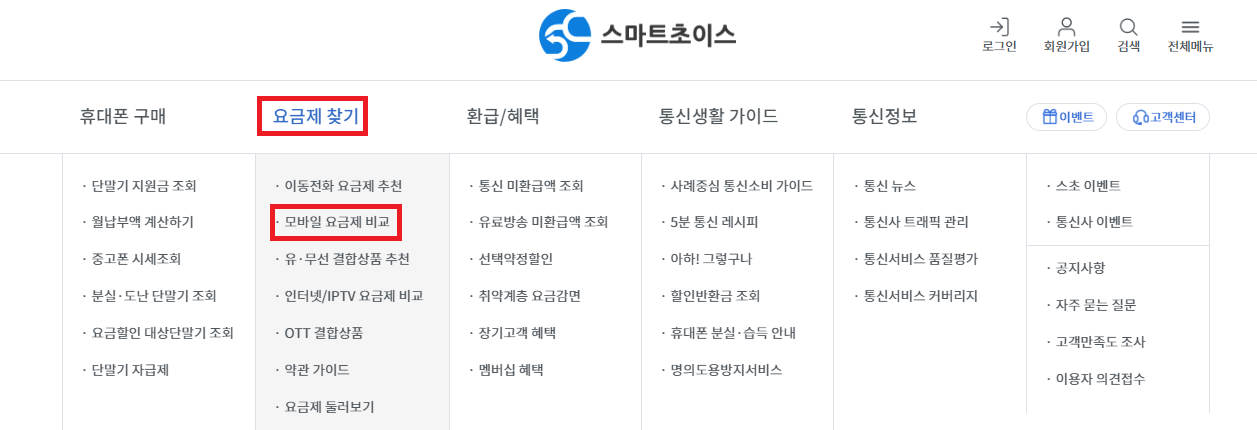 ① 스마트초이스 홈페이지(https://www.smartchoice.or.kr) 접속 > 요금제 찾기 > 모바일 요금제 비교 클릭