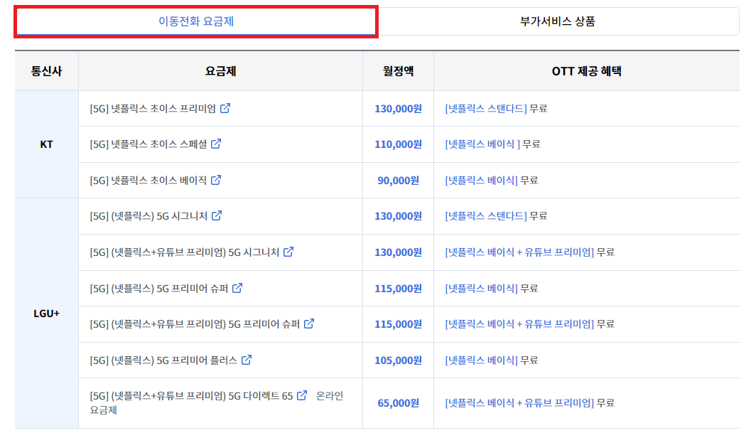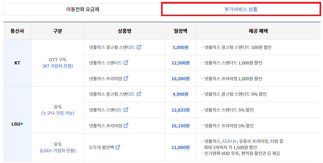 1. 이동통신 + OTT 결합상품 가격비교