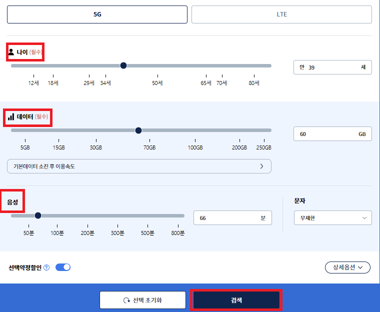 ② 나이, 데이터, 음성 사용 선택 > 검색 클릭