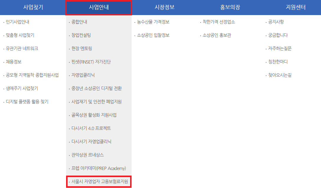 ①자영업지원센터 누리집 접속 > 상단 '사업안내' > '서울시 자영업자 고용보험료 지원' 클릭